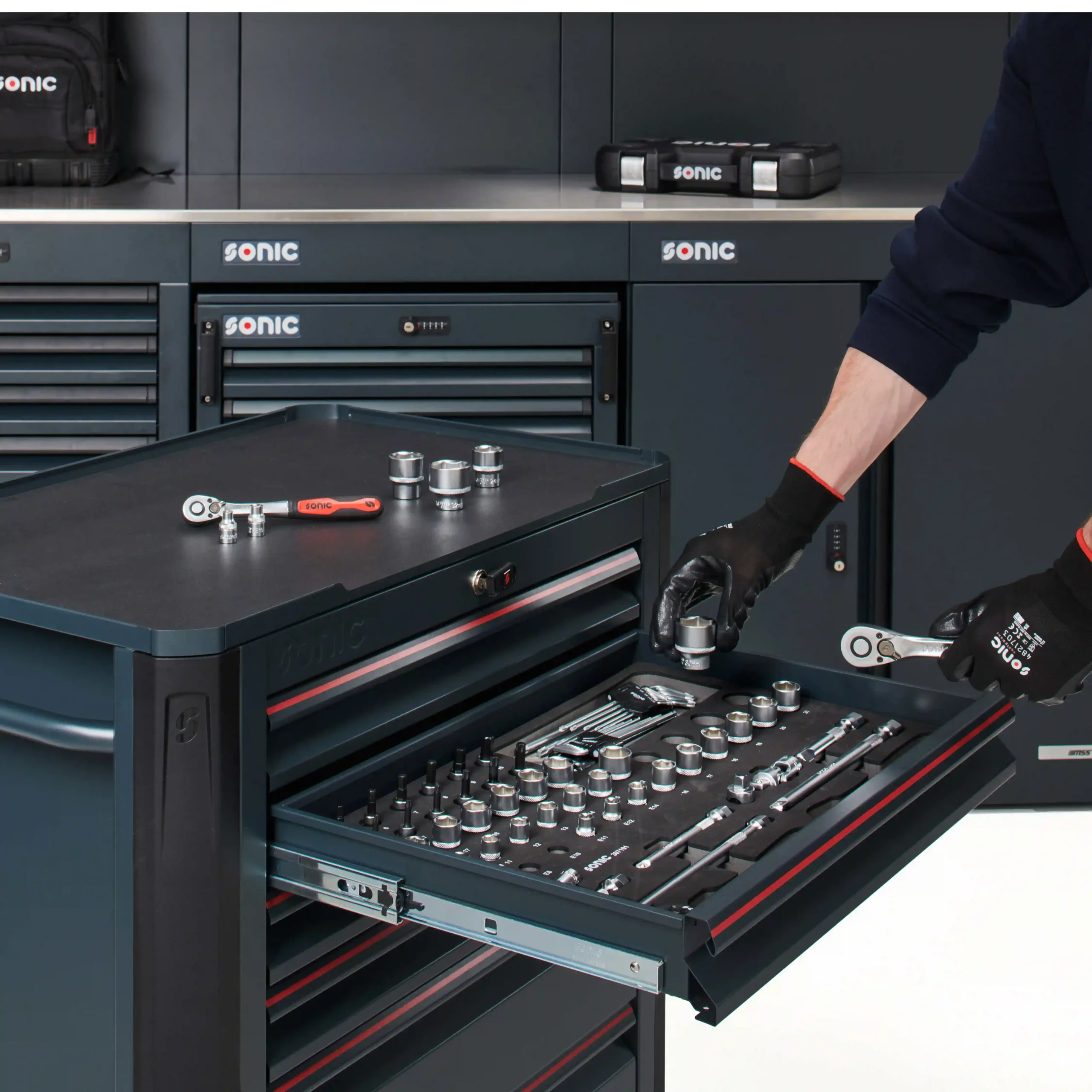 Met Sonic haal je niet alleen gereedschap, maar complete oplossingen in huis. Denk aan modulaire werkplaatsen, slimme gereedschapsmodules en ergonomische werkplekken. Efficiëntie en design in één.